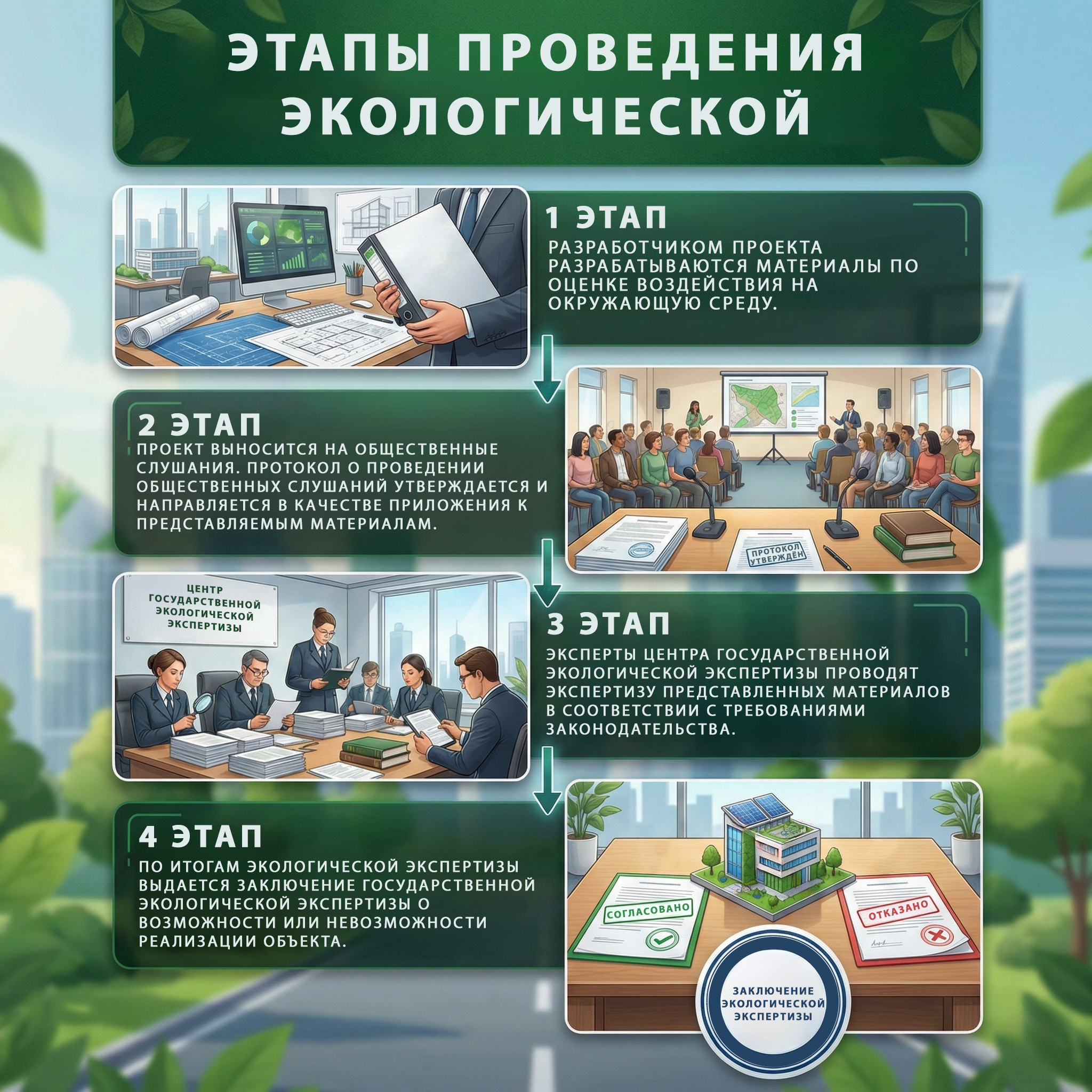 Based on the results of the expertise, an official conclusion is issued on the admissibility or inadmissibility of project implementation. This conclusion serves as the legal basis for making a decision on the approval or rejection of the planned activity.