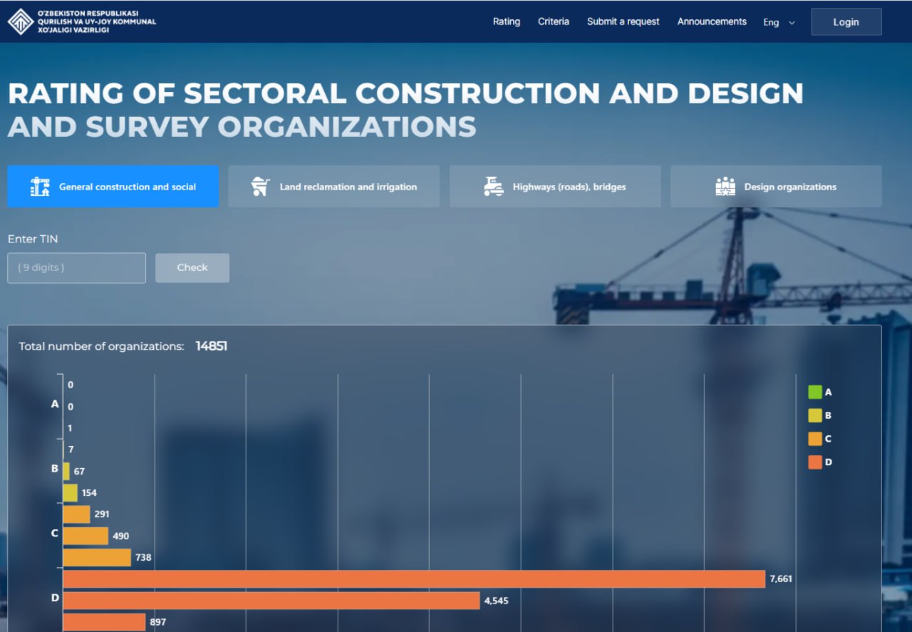 For example, the Ministry of Poverty Reduction and Employment provides information on the number of employees hired by an organization. The Tax Committee submits data on paid taxes, accrued wages, and net income. The Road Traffic Safety Service, the Inspectorate for Supervision of the Mining and Geological Industry, and the Inspectorate for Supervision of the Agro-Industrial Complex provide information on lifting equipment, transportation means, and other machinery used in construction. Based on these data, the rating is formed.