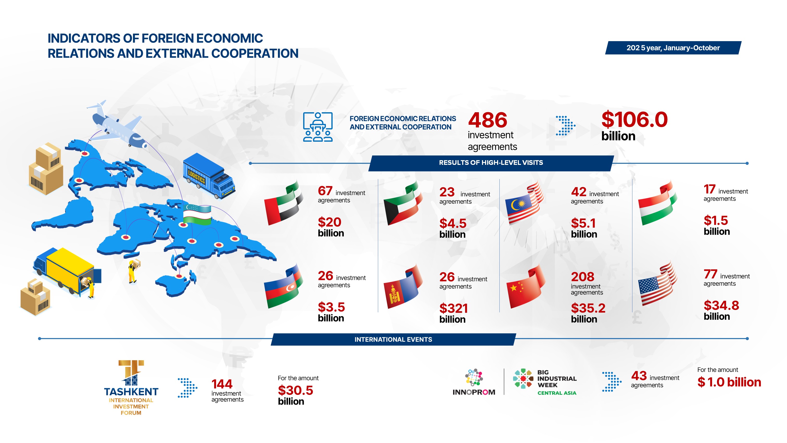 The Ministry of Investment, Industry and Trade of the Republic of Uzbekistan (MIIT) actively develops international cooperation as a key area of its activities aimed at deepening bilateral and multilateral relations, implementing joint projects, strengthening strategic partnerships, and promoting the country’s economic interests abroad. This includes negotiations and agreements with foreign states and international organizations in the fields of industry, trade, and investment.