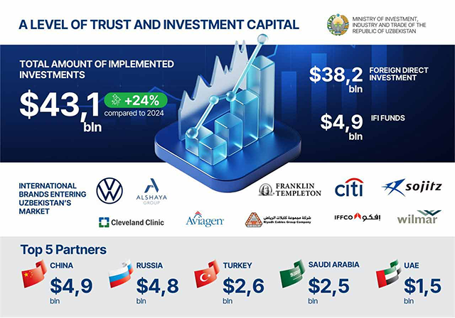 The Ministry of Investments, Industry and Trade of the Republic of Uzbekistan (MIIT) carries out comprehensive efforts to create a favorable environment for attracting investments, develop investment policy, support investment projects, and engage with foreign and domestic investors. The Ministry also actively promotes the country’s investment potential at international platforms by analyzing opportunities, providing support, and offering informational assistance to investors in key sectors of the economy.