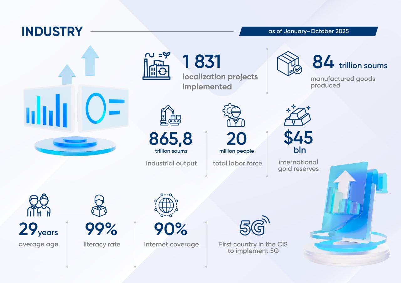 In addition, MIIT analyzes the potential and opportunities of leading industrial sectors, provides support and information, and actively promotes Uzbekistan’s industrial potential in the international arena.Official statistical data on industrial production in the Republic of Uzbekistan are available on the state statistics portal:https://stat.uz/uz/rasmiy-statistika/industry-2