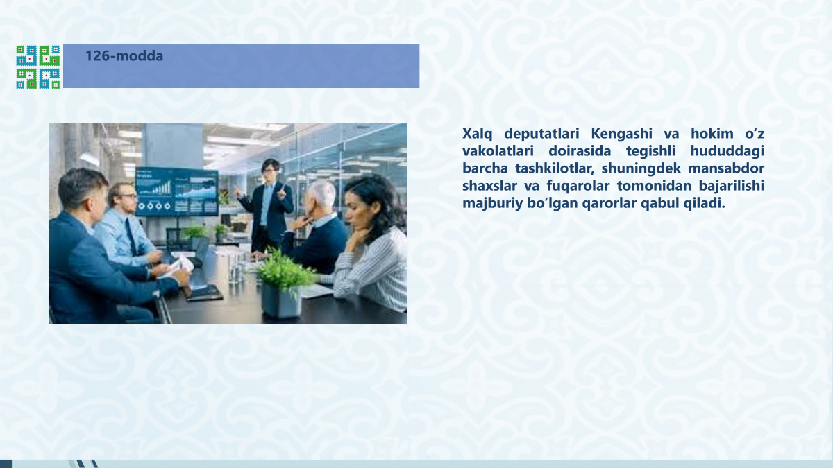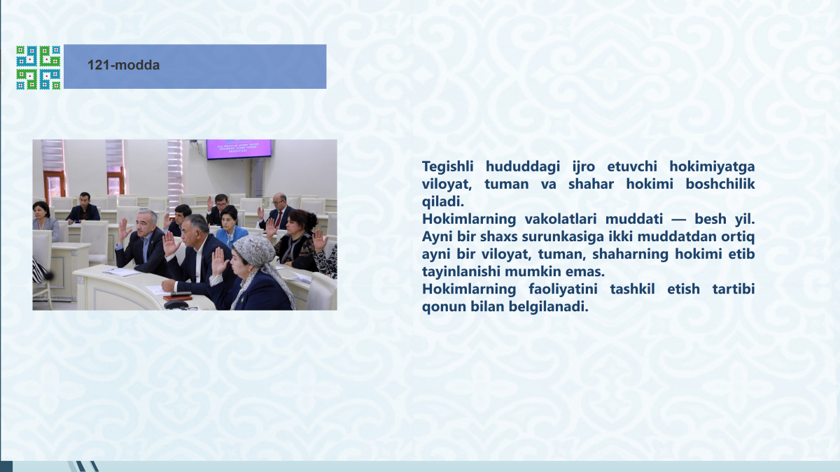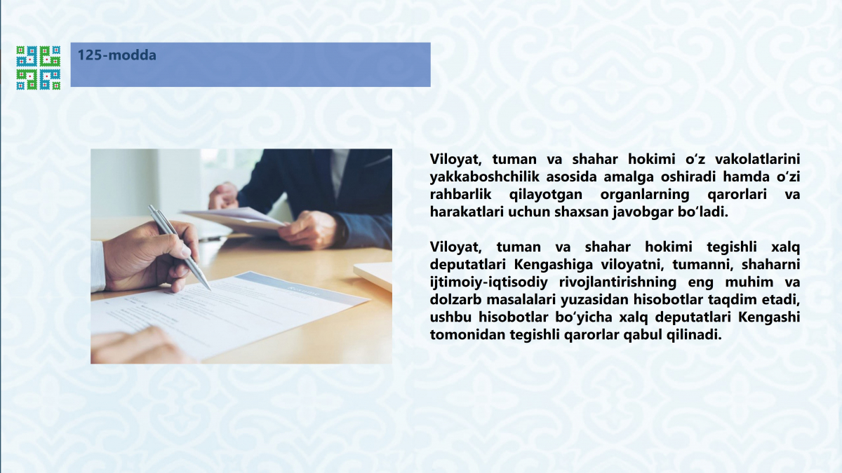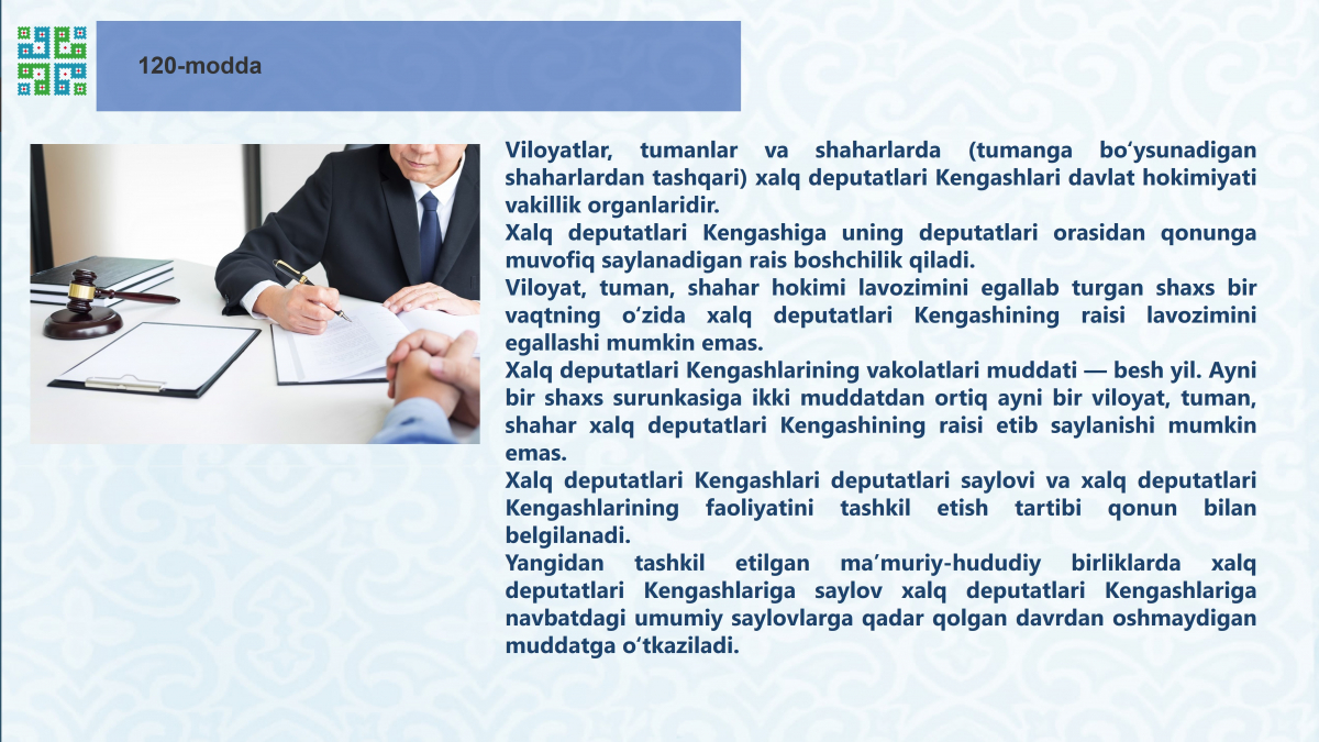 - O'zbekiston Respublikasi Konstitutsiyasining 120, 121, 123, 124, 125 va 126-moddalarini tushuntirishga qaratilgan ko'rgazmali materiallar, infografika hamda vizual axborotlar (*pdf formatida yuklab olish);
