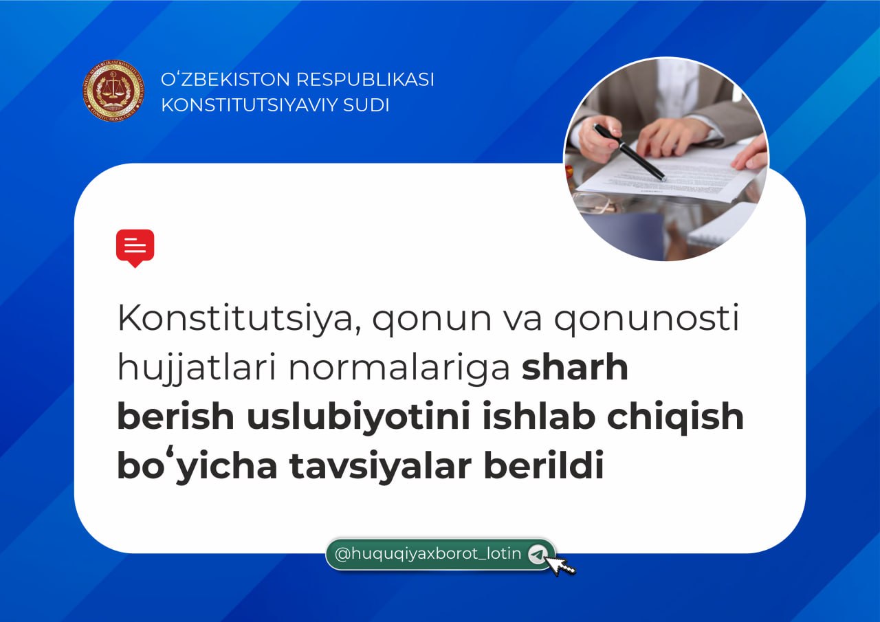 Konstitutsiya, qonun va qonunosti hujjatlari normalariga sharh berish amaliyoti mamlakatimizda keng uchramasligiga e'tibor qaratilib, bu ko'p jihatdan normativ-huquqiy hujjatlarga sharh berish uslubiyoti ishlab chiqilmaganligi bilan bog'liq, deb hisoblanadi. Shu sababdan Konstitutsiya, qonun va qonunosti hujjatlari normalariga sharh berish uslubiyotini ishlab chiqish bo'yicha mas'ul tashkilotlarga tavsiyalar berildi.
