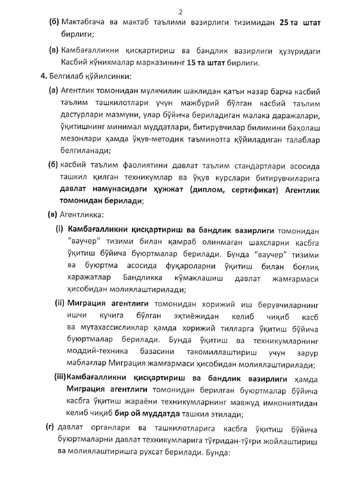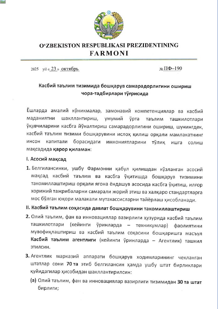 Farmonga asosan, Oliy ta’lim, fan va innovatsiyalar vazirligi huzurida Kasbiy ta’lim agentligi tashkil etildi.