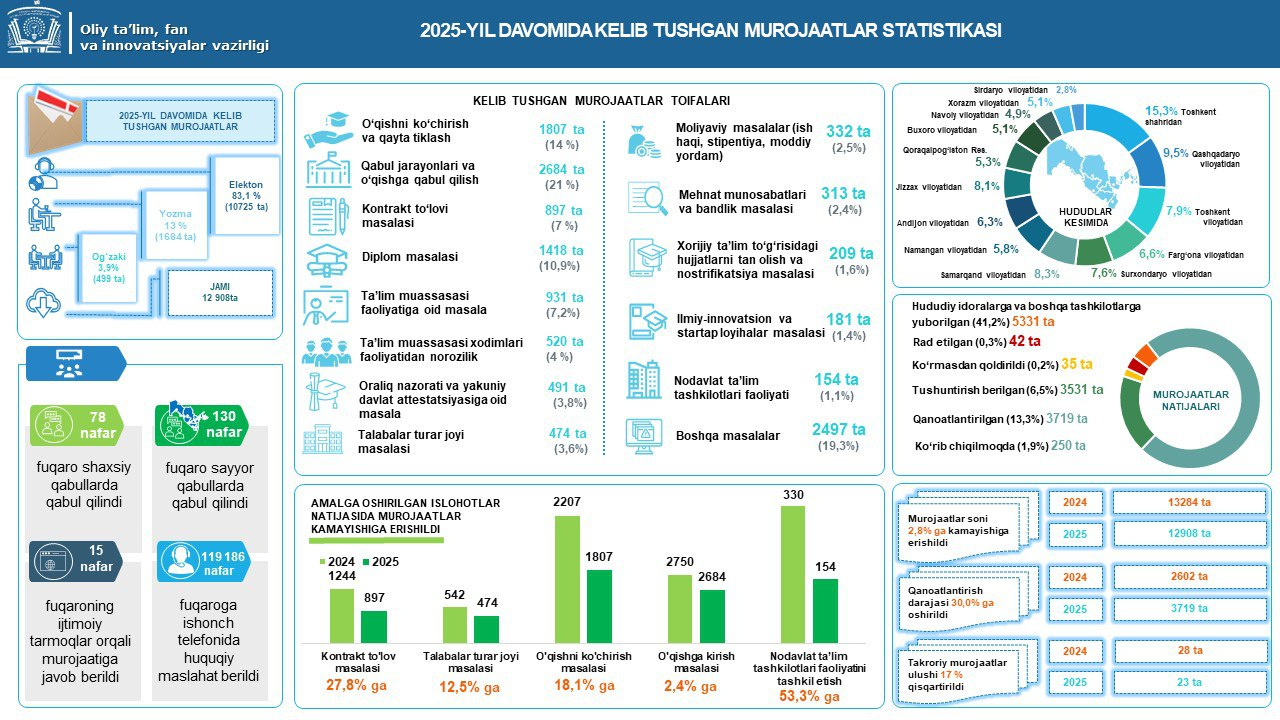 2025-yil yanvar-dekabr oylarida Oliy taʼlim, fan va innovatsiyalar vazirligiga “Ijro.gov.uz” tizimi orqali Oʻzbekiston Respublikasi Prezidenti Administratsiyasi rahbarining 56 ta hujjati kelib tushgan boʻlib, shundan 45 tasi Oʻzbekiston Respublikasi Prezidenti Administratsiyasi rahbari rezolyutsiyasi.