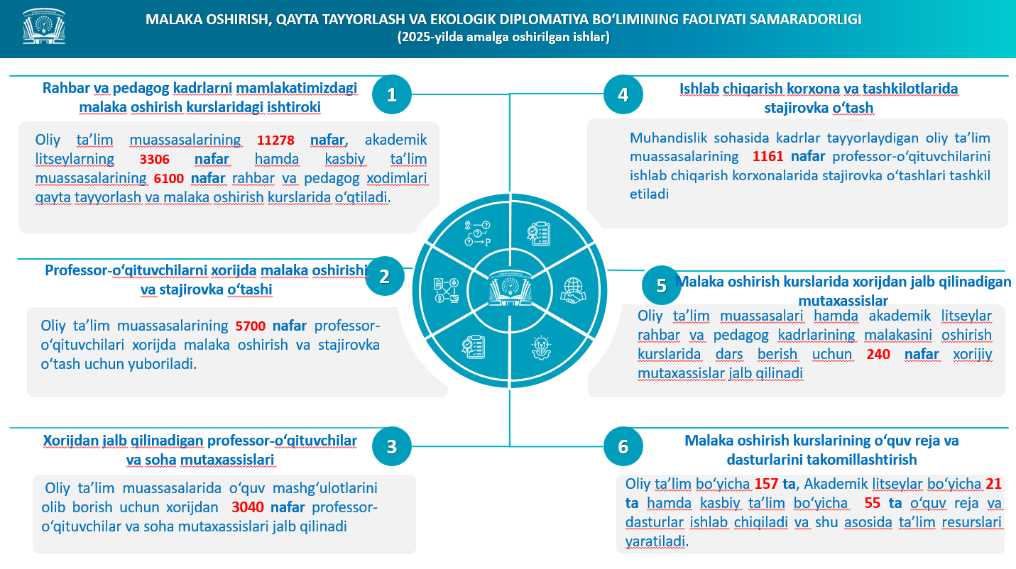 2025-yilda oliy taʼlim muassasalarining jami 11 627 nafar rahbar va pedagog kadrlari malaka oshirdi. Ularning 5 559 nafari (barcha malaka oshirgan tinglovchilarning 47,8 foizi) qayta tayyorlash va malaka oshirish markazlarida bevosita oʻqish orqali,
