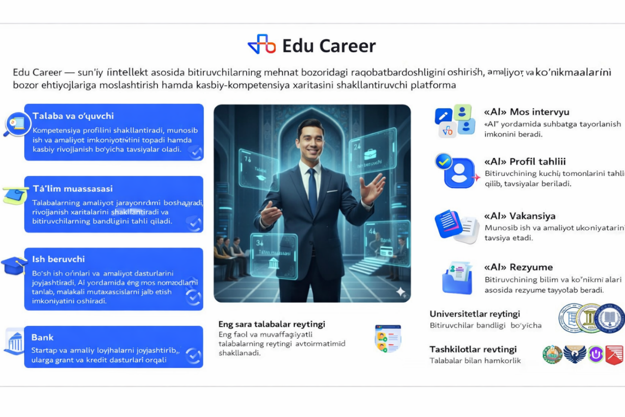 bitiruvchilarning 63 364 nafari ish beruvchilar bilan suhbatlashib, ularning 17 535 nafari oʻziga mos ish oʻrnini topdi, shuningdek, 1 806 nafar talaba oʻz biznes loyihalarini taqdim etib, tadbirkorlikka yoʻnaltirildi;