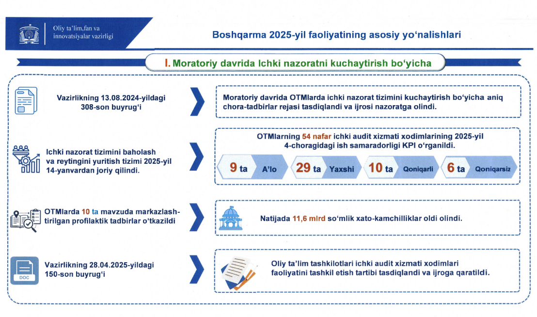 2025-yilda oliy taʼlim, fan va innovatsiyalar sohasini tartibga soluvchi jami 53 ta normativ-huquqiy hujjatlar qabul qilingan boʻlib, ulardan: