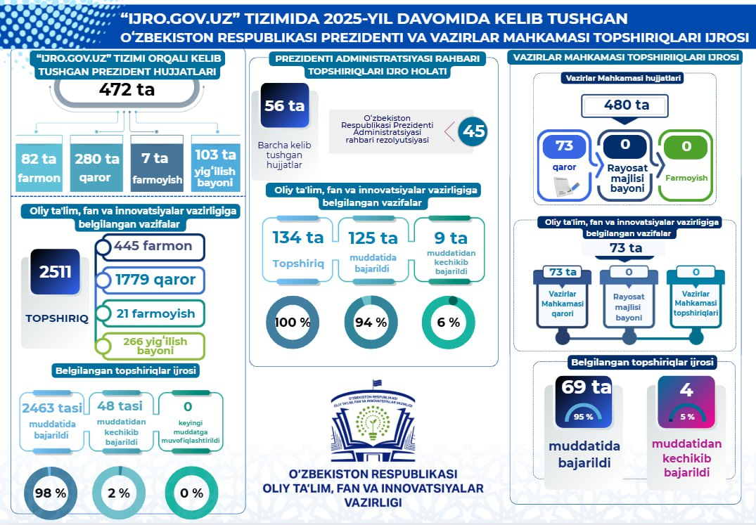 2025-yil yanvar-dekabr oylarida Oliy taʼlim, fan va innovatsiyalar vazirligi “Ijro.gov.uz” tizimi orqali Oʻzbekiston Respublikasi Prezidentining 472 ta hujjati kelib tushgan boʻlib, shundan 82 tasi Oʻzbekiston Respublikasi Prezidenti Farmonlari, 280 tasi Oʻzbekiston Respublikasi Prezidenti qarori, 7 tasi Oʻzbekiston Respublikasi Prezidenti Farmoyishi va 103 tasi Oʻzbekiston Respublikasi Prezidenti yigʻilish bayonlari hisoblanadi.