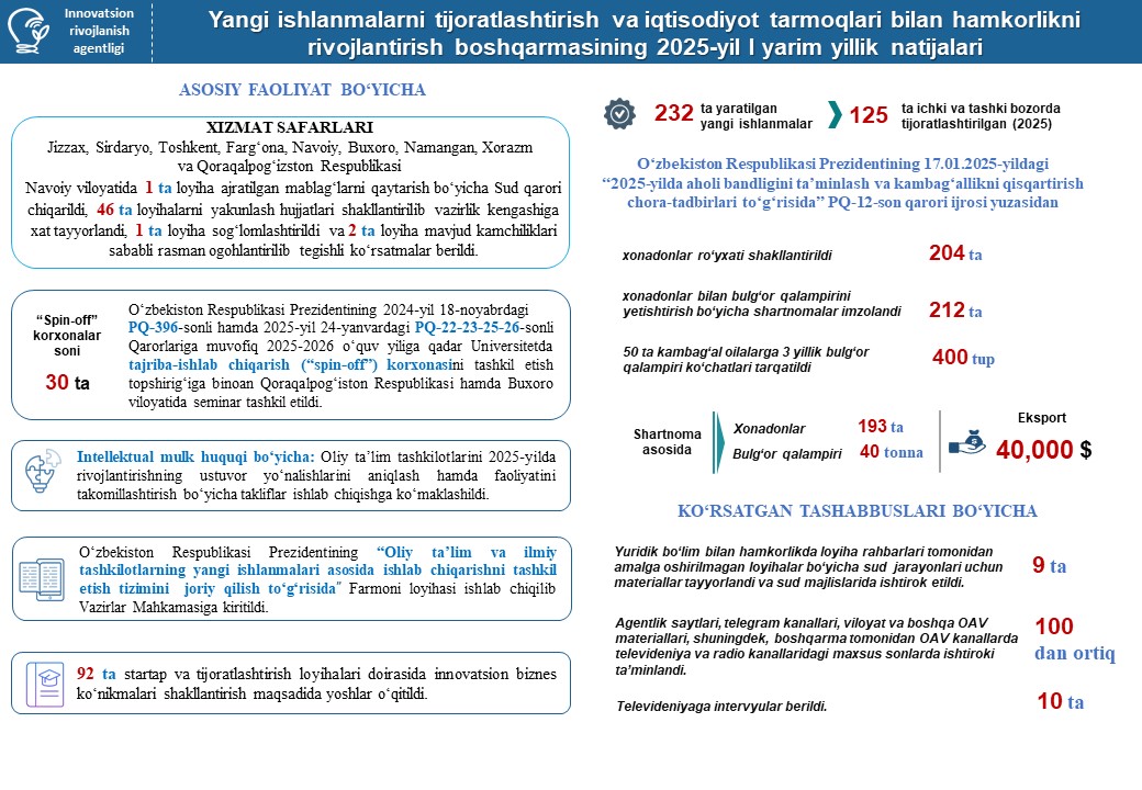 Shuningdek, 2025-yilda ichki va tashqi bozorlarda tijoratlashtirilgan yangi ishlanmalar soni 125 tani tashkil qilmoqda.