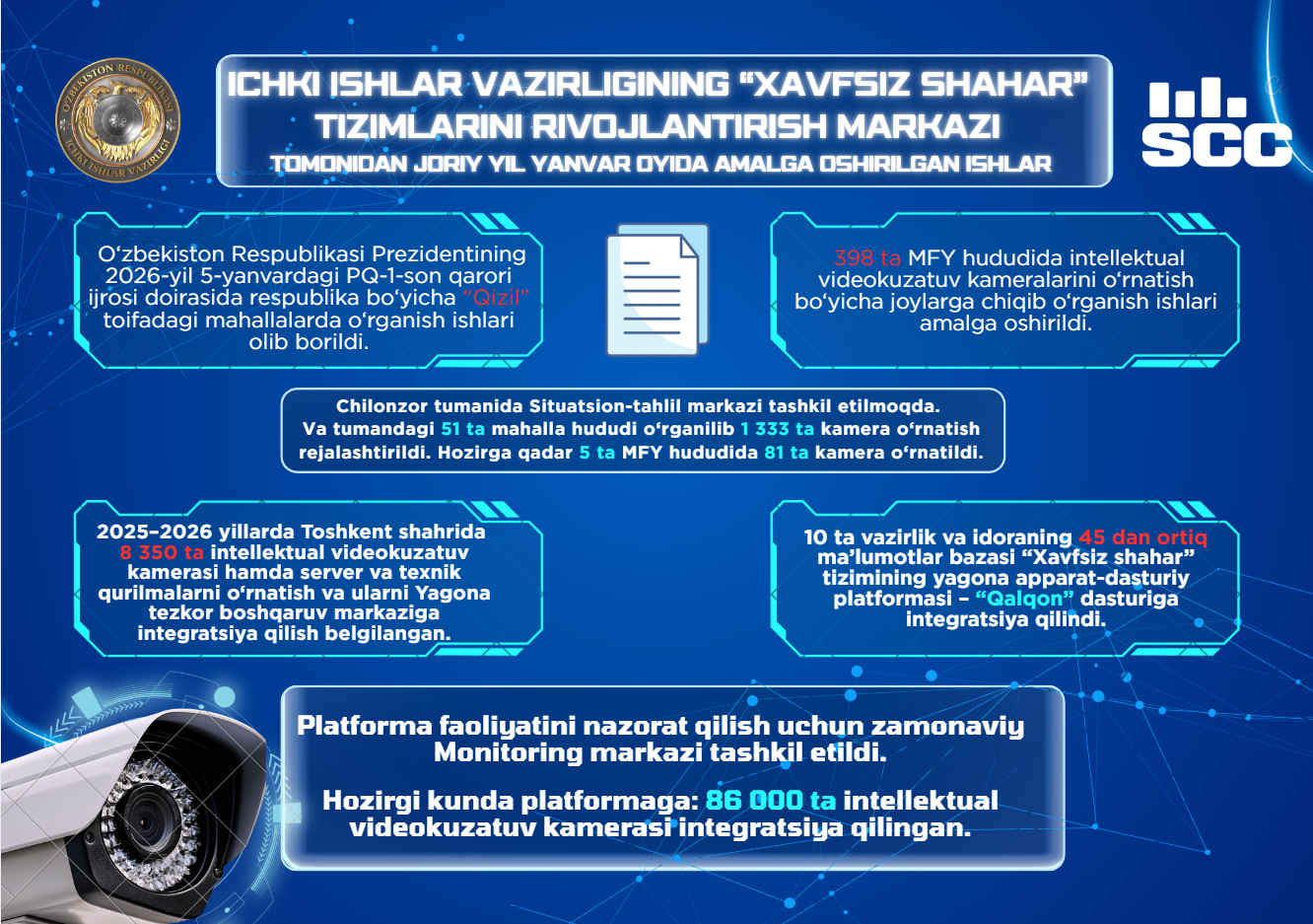 Ichki ishlar vazirligining “Xavfsiz shahar” tizimlarini rivojlantirish markazi tomonidan 2026 yilning yanvar oyida amalga oshirilgan ishlar