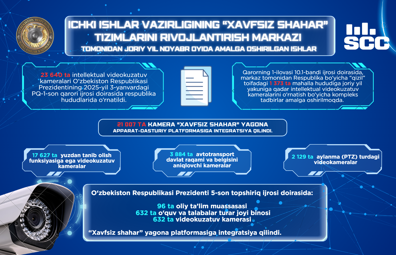 Ichki ishlar vazirligining “Xavfsiz shahar” tizimlarini rivojlantirish markazi tomonidan 2025 yilning noyabr oyida amalga oshirilgan ishlar