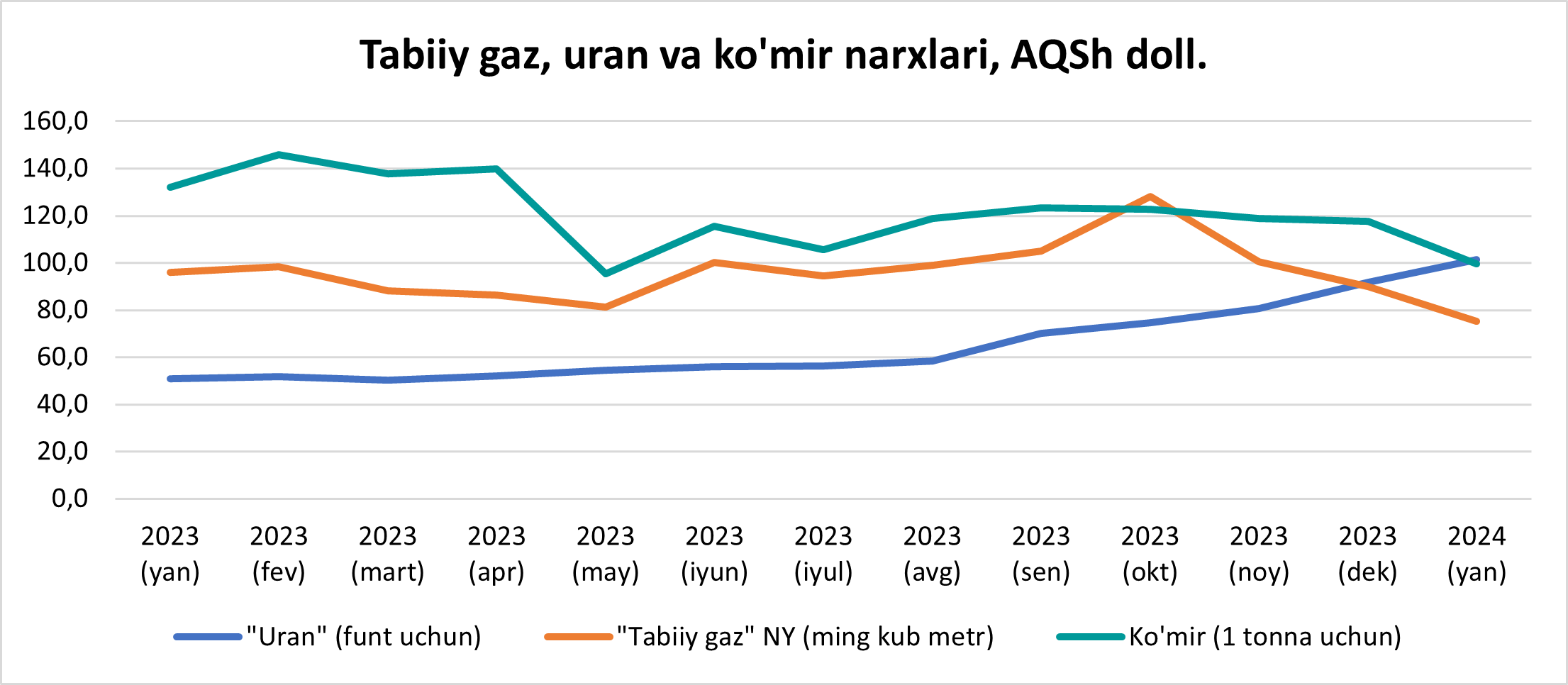 Yanvar oyida oʻtgan yilning mos davriga nisbatan jahon birjalarida neft (Brent) narxi -3,3 foizga, benzin (NY) narxi -13,2 foizga, tabiiy gaz NY -21,8 foizga (London birjasida -8,3 foizga va Niderlandiyada -8,4 foizga) va koʻmir (Rotterdam) -24,5 foizga arzonlashgan boʻlsa, uran (CME) narxi +99,2 foizga oshdi. Jahon birjalarida tabiiy uran narxining oshishi ushbu tovar eksportini 31,1 mln dollarga oshirdi.