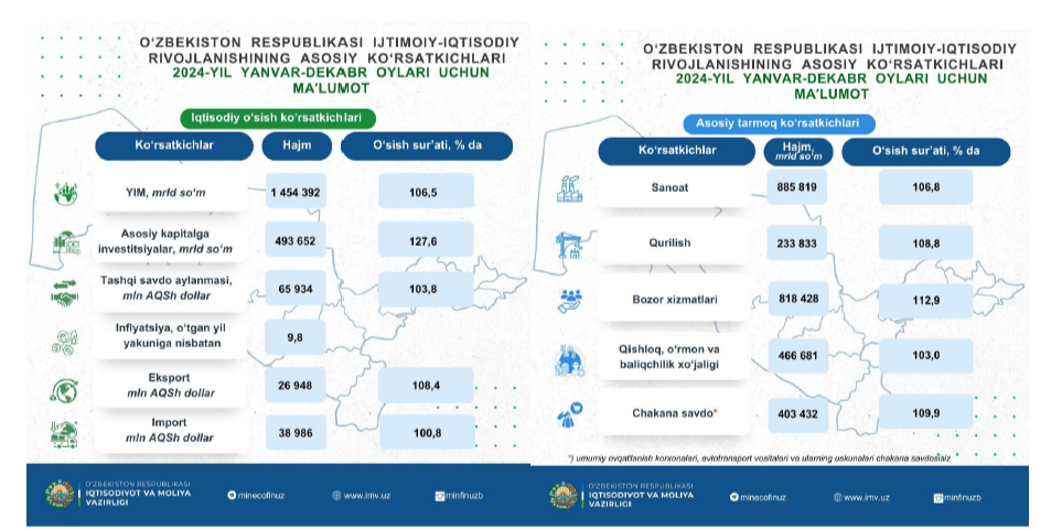 O‘zbekiston Respublikasi ijtimoiy-iqtisodiy rivojlanishining 2024-yil yanvar-dekabr oylaridagi asosiy ko‘rsatkichlari