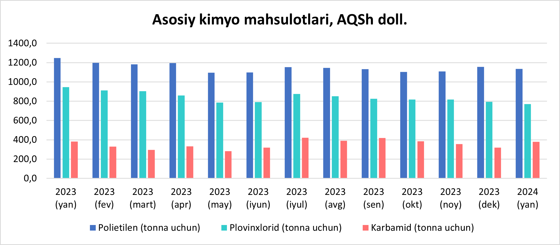 Yanvar oyida oʻtgan yilning mos davrida polimer bozorida polietilen narxi -9 foizga va polivinilxlorid -18,6 foizga karbamid narxi -0,7 foizga pasaygan boʻlsa, Nyu york birjasida pilomateriallar narxi +7,1 foizga oshdi. Jahon birjalarida karbamid narxining pasayishi ushbu tovar eksportini 4 mln dollarga kamaytirdi.