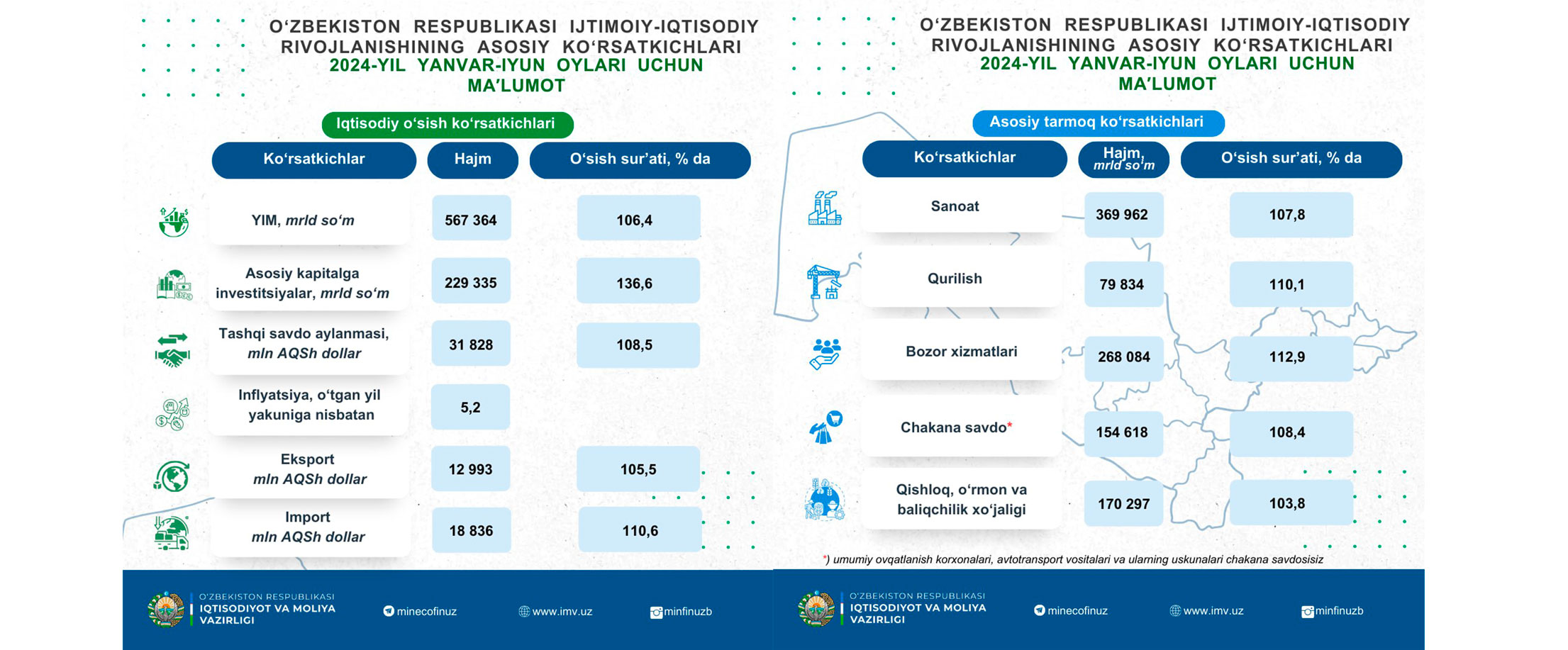 O‘zbekiston Respublikasi ijtimoiy-iqtisodiy rivojlanishining 2024-yil yanvar-iyun oylaridagi asosiy ko‘rsatkichlari