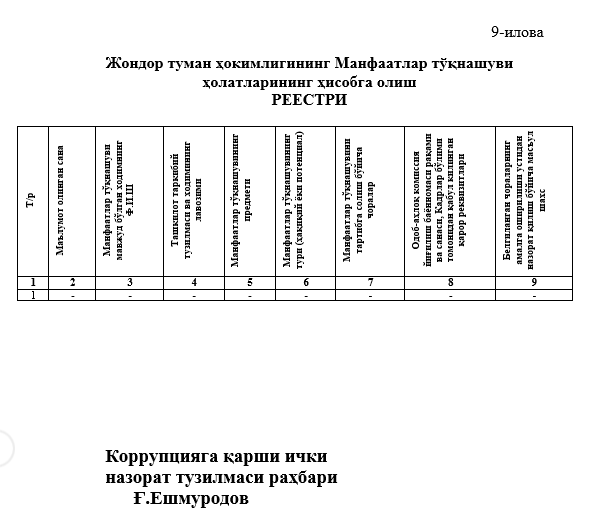 Jondor tuman hokimligining Manfaatlar to'qmashuvi holatlarining hisobga olish reestri