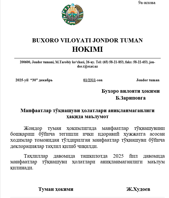 Jondor tuman hokimligining Manfaatlar to'qmashuvi holatlarining hisobga olish reestri hamda manfaatlar to'qnashuvi holatlari aniqlanmaganligi haqida ma'lumot