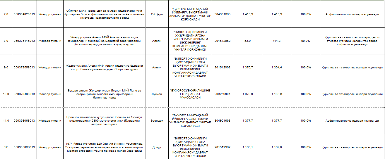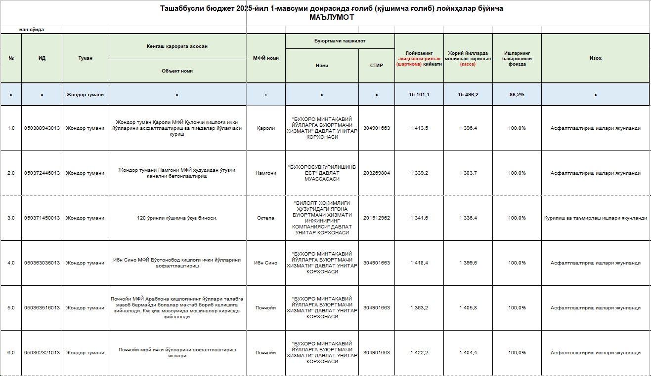 Tashabbusli byudjet 2025-yil 1-mavsumi doirasida g'olib loyihalar (qurilishlar) bo'yicha ma'lumot