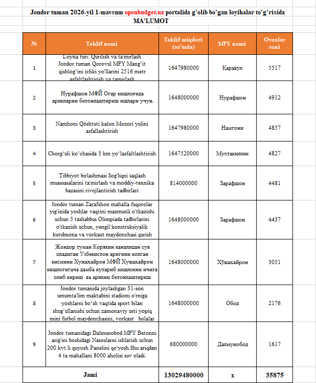 Jondor tuman 2026-yil 1-mavsum openbudget.uz portalida g'olib bo'lgan loyihalar to'g'risida ma'lumot
