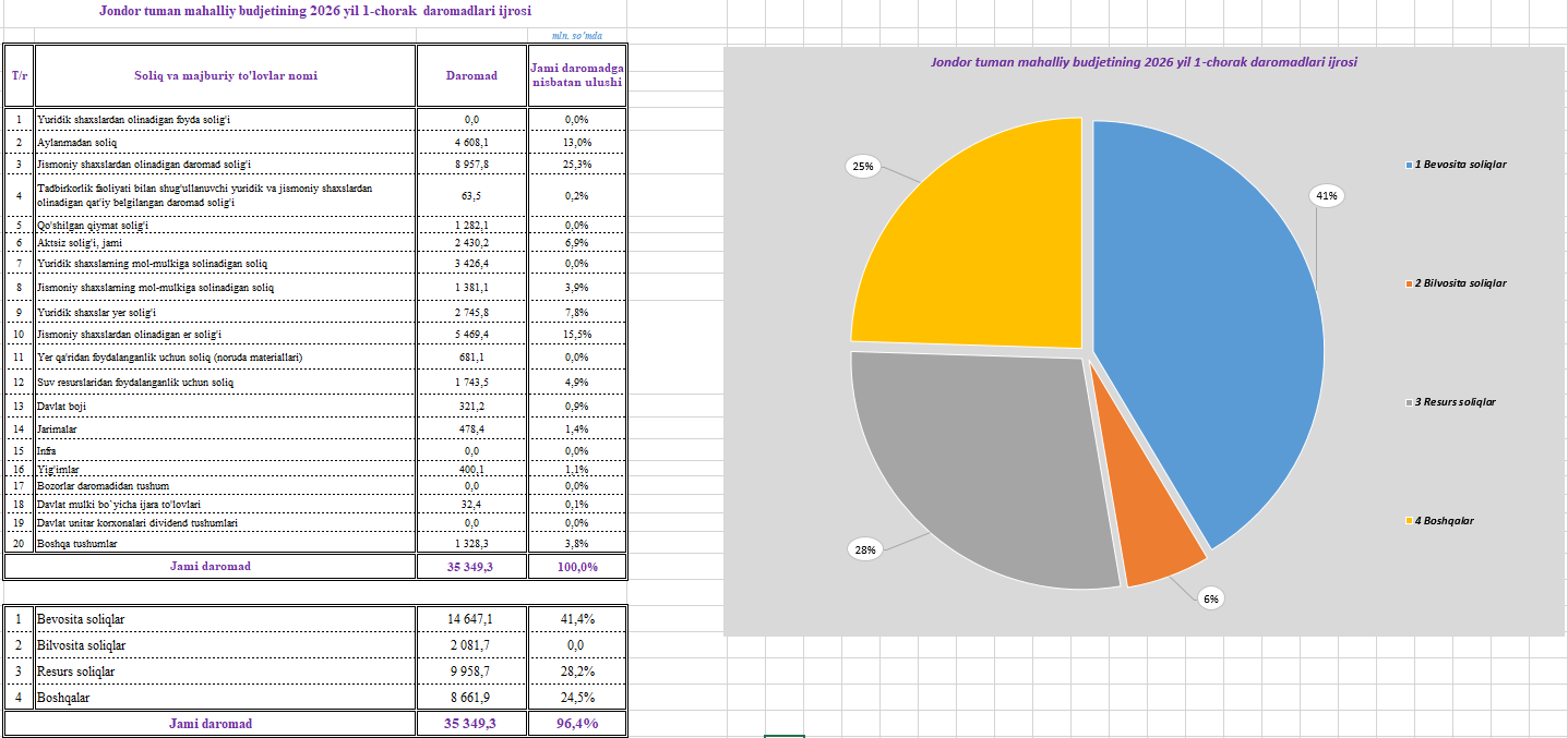 Jondor tuman mahalliy byudjetining 2026-yil 1-chorak daromadlar ijrosi