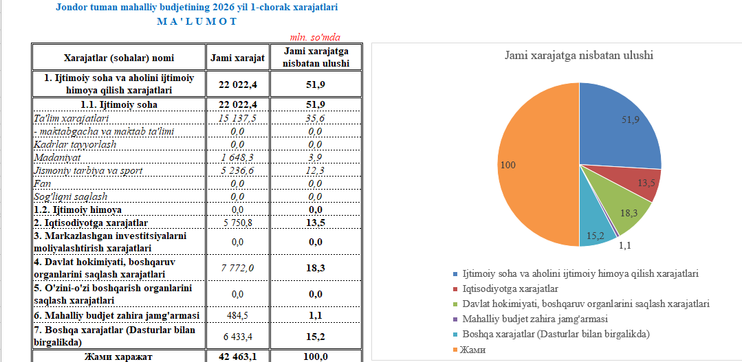 Jondor tuman mahalliy byudjetining 2026-yil 1-chorak xarajatlari