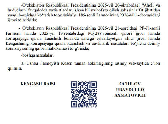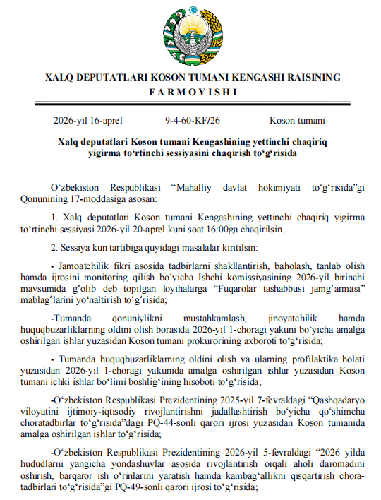 Xalq deputatlari Koson tumani Kengashining yettinchi chaqiriq yigirma to‘rtinchi sessiyasini o'tkaziladi