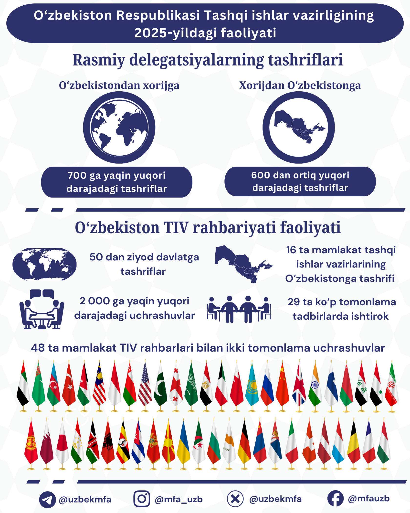 E’tiboringizga O‘zbekiston Tashqi ishlar vazirligining 2025-yil davomida amalga oshirilgan tashqi siyosiy faoliyati yakunlariga bag‘ishlangan yillik brifingni taqdim etamiz.