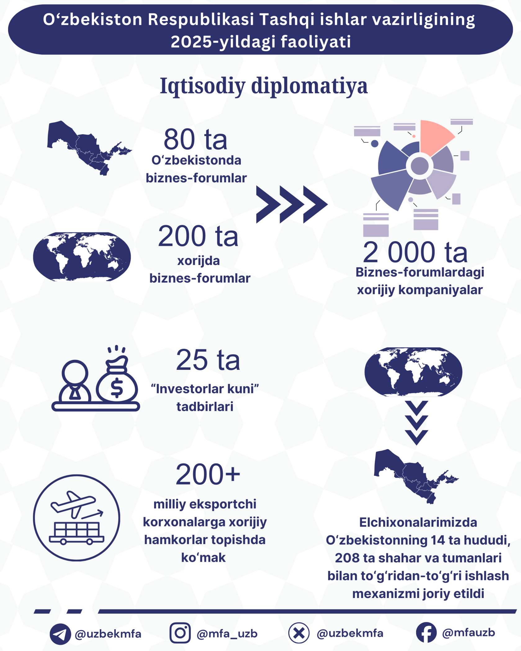 2025-yil davomida O‘zbekistonning xorijdagi diplomatik vakolatxonalari ko‘magida mamlakatimiz hududlarida 80 dan ortiq, xorijda esa 200 ga yaqin biznes-forumlar hamda 25 ta “Investorlar kuni” tadbirlari tashkil etildi. Mazkur tadbirlarda 2000 ga yaqin xorijiy kompaniyalar ishtiroki ta’minlanib, hududlarning investitsiyaviy salohiyatini keng targ‘ib etish, to‘g‘ridan-to‘g‘ri ishbilarmonlik aloqalarini yo‘lga qo‘yish va amaliy hamkorlikni rivojlantirishga xizmat qildi.