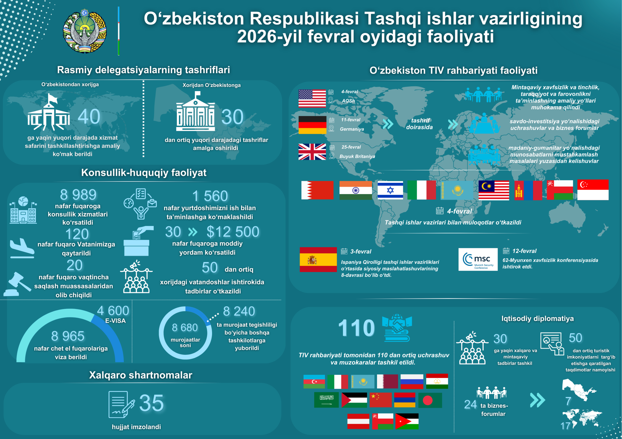 Tashqi ishlar vazirligining 2026-yil fevral oyidagi faoliyati to‘g‘risida