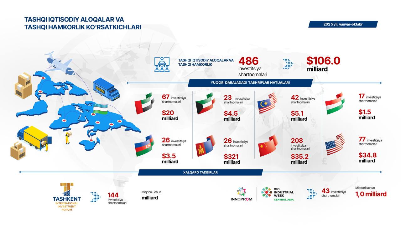 O‘zbekiston Respublikasi Investitsiyalar, sanoat va savdo vazirligi (ISSV) o‘z faoliyatining muhim yo‘nalishlaridan biri sifatida xalqaro hamkorlikni faol rivojlantirib, ikki tomonlama va ko‘p tomonlama munosabatlarni chuqurlashtirish, qo‘shma loyihalarni amalga oshirish, strategik sheriklikni mustahkamlash hamda sanoat, savdo va investitsiyalar sohalarida xorijiy davlatlar va xalqaro tashkilotlar bilan muzokaralar va kelishuvlar orqali mamlakatning iqtisodiy manfaatlarini xorijda ilgari surishga qaratilgan ishlarni olib bormoqda.