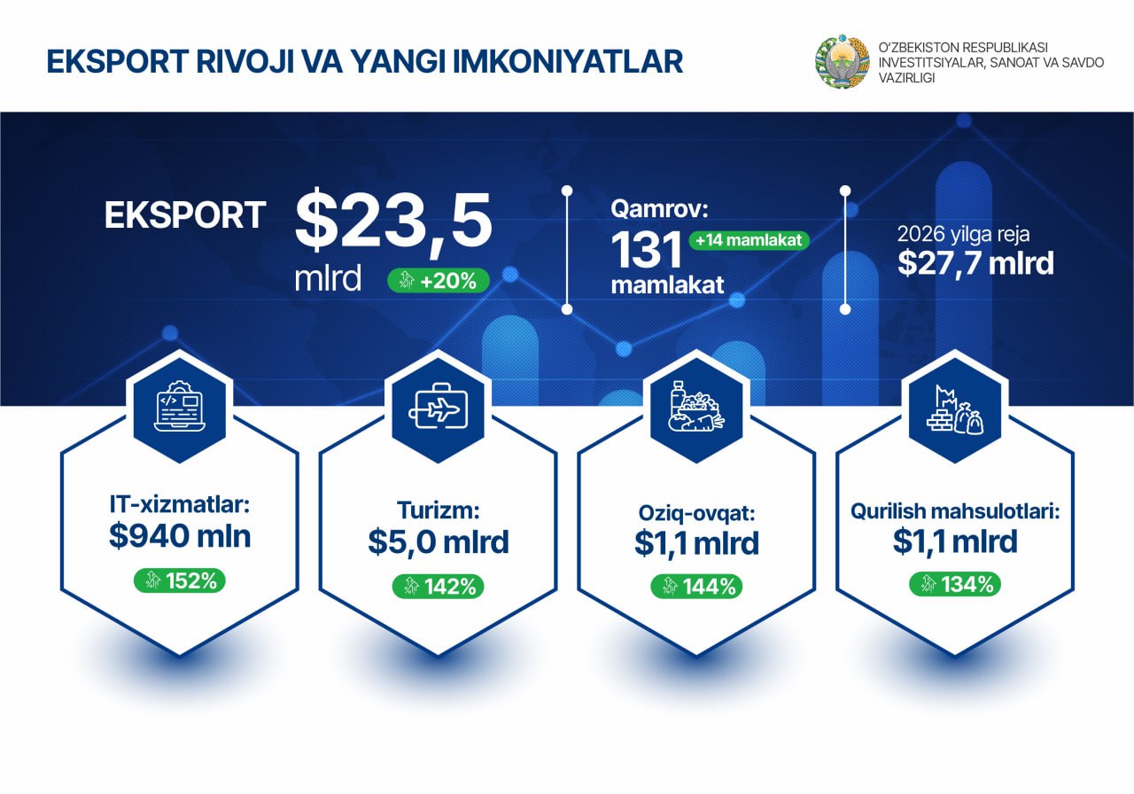 O‘zbekiston Respublikasi Investitsiyalar, sanoat va savdo vazirligi (ISSV) tashqi savdo sohasida mamlakatning eksport salohiyatini kengaytirish, eksportyor va importyorlar uchun qulay shart-sharoitlar yaratish, savdo tartib-taomillarini takomillashtirish hamda xorijiy bozorlar bilan savdo-iqtisodiy aloqalarni mustahkamlashga qaratilgan tizimli siyosatni amalga oshirmoqda.