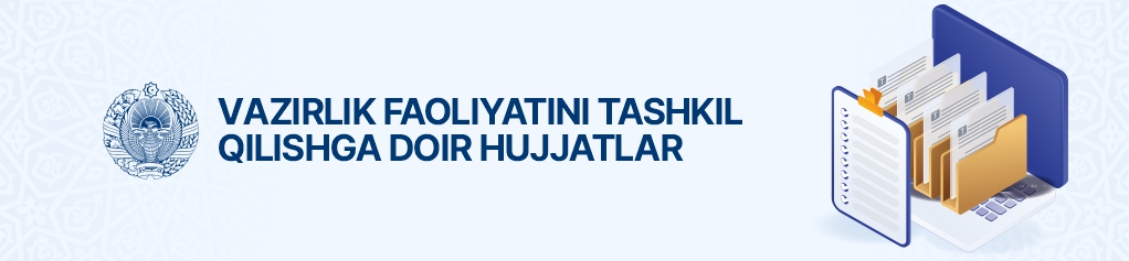 Foydalanuvchilar uchun qulaylik yaratish maqsadida vazirlik faoliyatiga bevosita taalluqli bo‘lgan asosiy qonunlar, Prezident farmonlari va qarorlari, Vazirlar Mahkamasining qarorlari, idoraviy hujjatlar hamda xalqaro shartnomalar jamlangan. Ushbu bo‘lim vazirlik faoliyatini tartibga soluvchi amaldagi hujjatlarni tezkor topish, ularning mazmuni bilan tanishish hamda normativ-huquqiy bazadagi o‘zgarishlarni kuzatib borish imkonini beradi. Batafsil ma’lumot bilan LexUZ huquqiy axborot portalida vazirlik faoliyatiga oid normativ-huquqiy hujjatlar orqali tanishishingiz mumkin.
