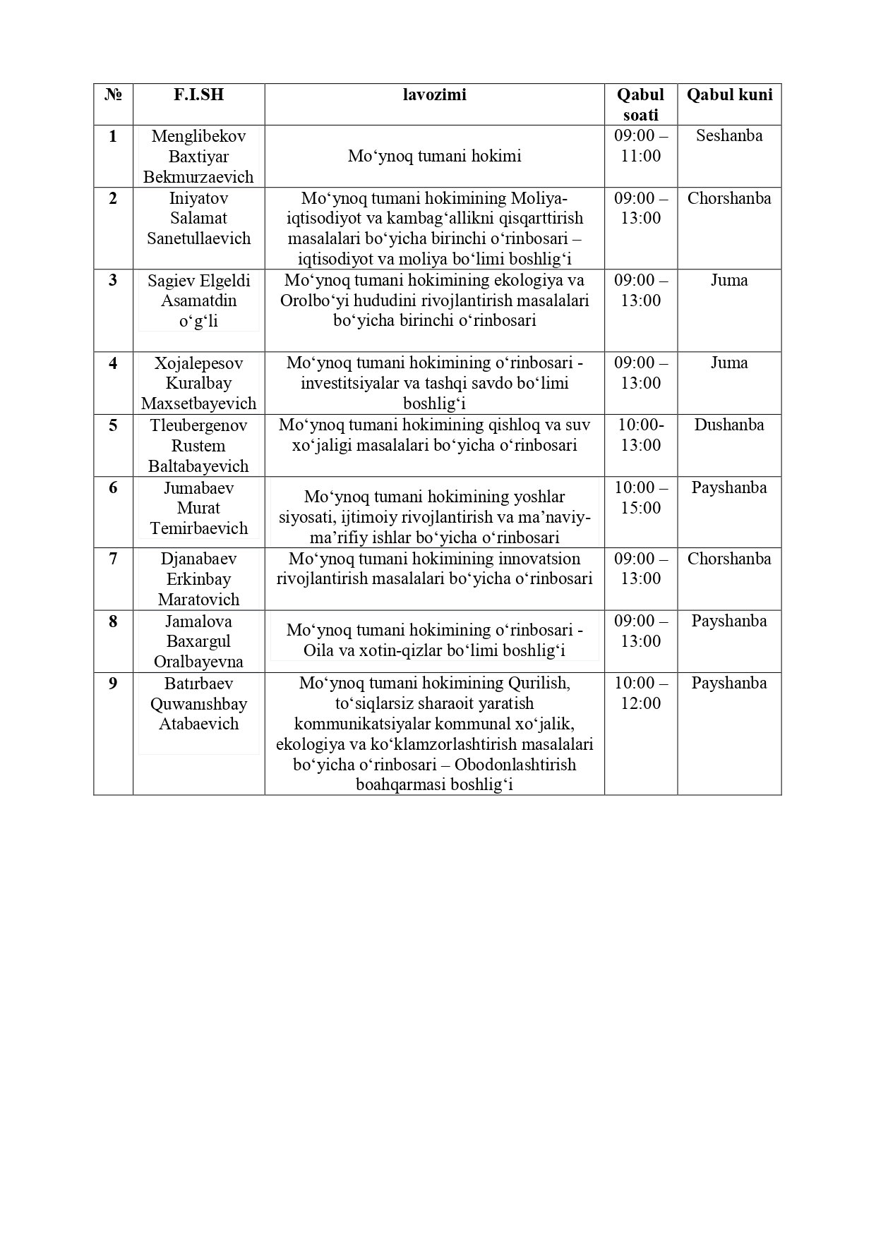 Mo‘ynoq tumani hokimligining huquqiy maqomi (tarkibiy bo‘linmalari, idoraviy mansub tashkilotlarning tuilmasi, vaziyfalari va funktsiyalarini) belgilaydigan normativ-huquqiy hujjat
