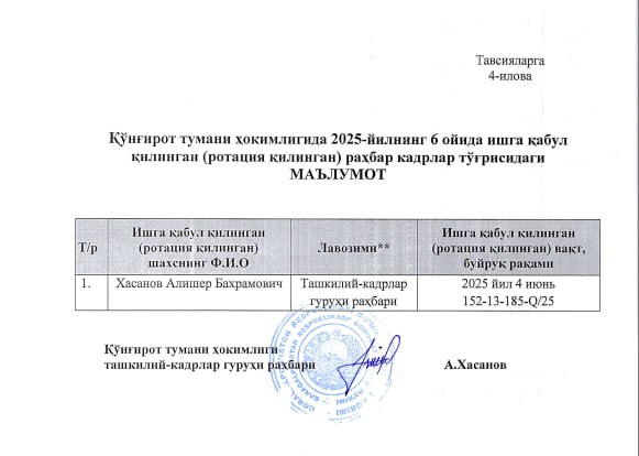 2. Qoraqalpog‘iston Respublikasi Qo‘ng‘irot tumanida 2025-yil 1-aprel holatiga ishga qabul qilingan (rotatsiya qilingan) rahbar kadrlar haqida ma’lumot