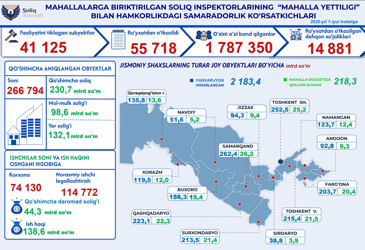 2025-yilning 1-iyul holatiga jismoniy shaxslarning turar joy obyektlariga yanvar-iyun oylarida 2,2 trln so‘m undirilgan. Shundan mahalla budjetiga 218,3 mlrd so‘m qolgan.