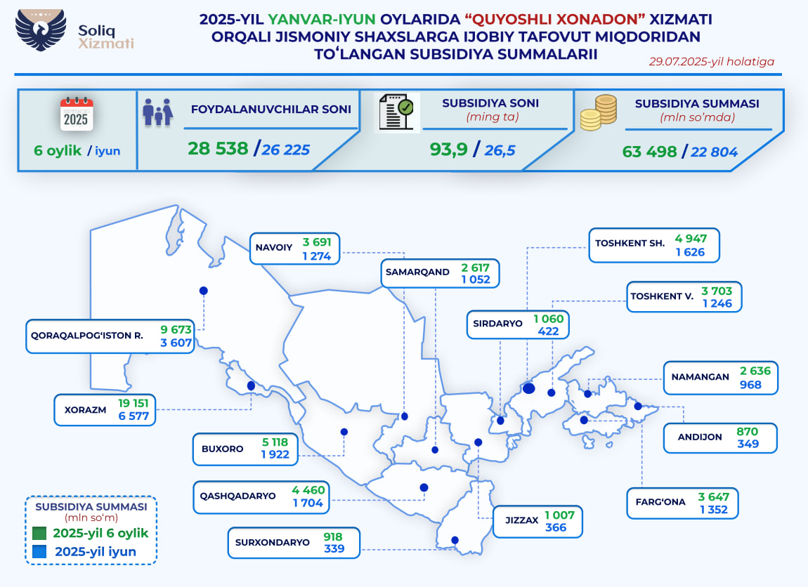 2025-yilning yanvar-iyun oylarida 28 538 nafar jismoniy shaxs elektr tarmoqlariga o‘tkazilgan quyosh energiyasi uchun 63 mlrd 498 mln so‘m davlat budjetidan subsidiya oldi.