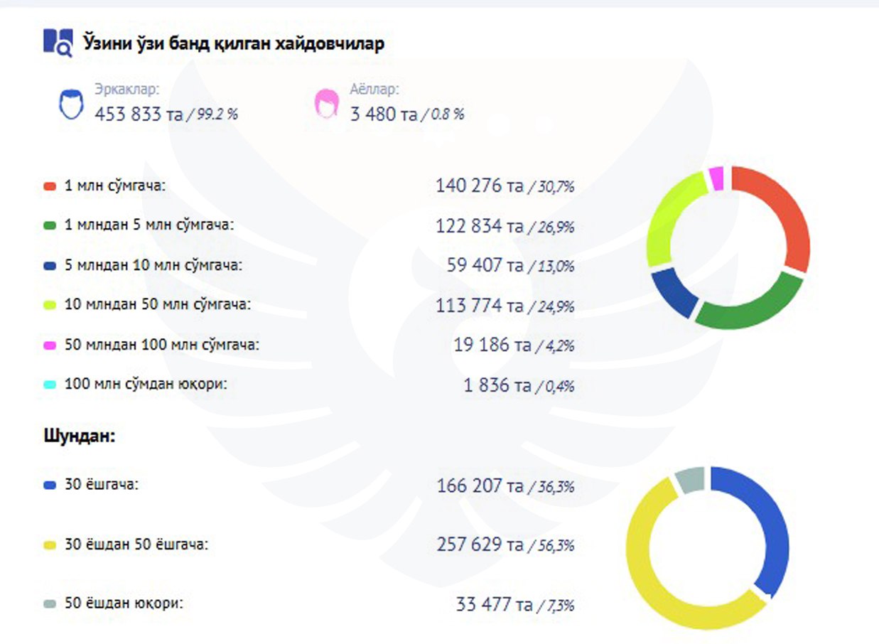 O'rtacha bitta chek 19 077 so'mni tashkil etgan (o'tgan yilda 18 456 so'm). Agregatorlar orqali yo'lovchi tashish bilan 457,3 mingga yaqin o'zini o'zi band qilgan haydovchilar shug'ullanmoqda. Haydovchilarning yarmidan ko'pi (56,3%) 30-50 yoshda – 257 629 kishi, 30 yoshgacha – 166 207 kishi (36,3%), 50 yoshdan kattalar – 33 477 kishi (7,3%).