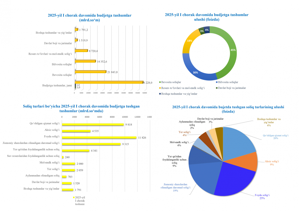 2025-yil 31-mart holatiga soliq turlari boʻyicha budjetga tushgan tushumlar toʻgʻrisida