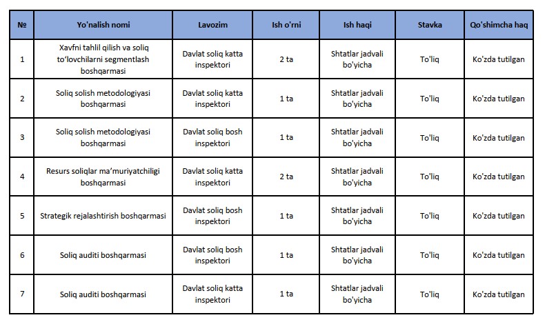 Yoshi, millati, jinsi, ijtimoiy kelib chiqishi, mulkiy va mansab mavqeyidan qat’iy nazar, o‘zlarining kasbiy, ishbilarmonlik, shaxsiy va axloqiy fazilatlar hamda ma’lumot darajasiga ega, shunindek, davlat fuqarolik xizmati lavozimini egallash huquqi qonunchilik bilan cheklanmagan va tegishli lavozimni egallash uchun malaka talablariga javob beradigan O‘zbekiston Respublikasi fuqarolari davlat soliq xizmati organlariga ochiq mustaqil tanlov orqali ishga qabul qilinadi.