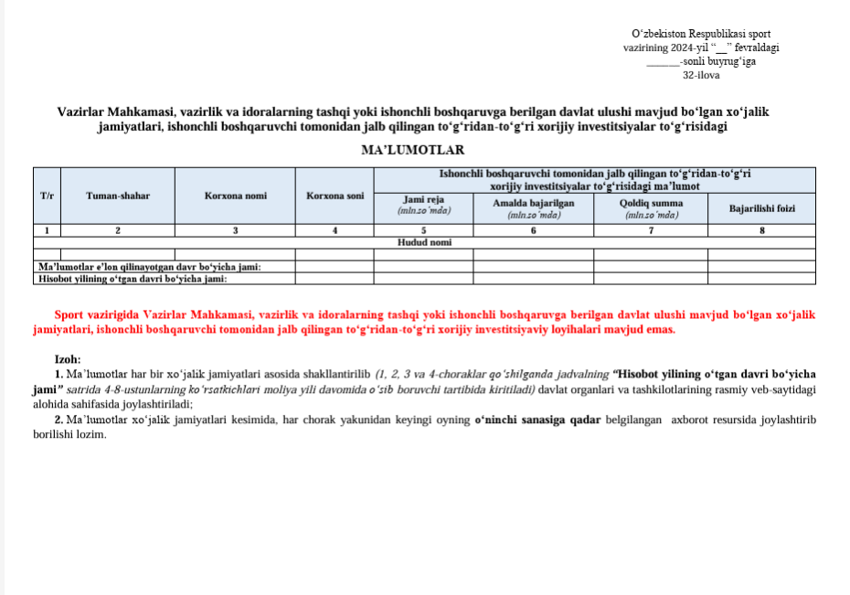 | Davlat budjeti, shuningdek, xalqaro moliya institutlari mablag‘lari hisobidan moliyalashtiriladigan loyihalar, shu jumladan istiqbolli investitsiya va infratuzilma loyihalari bo‘yicha ularning asosiy texnik ko‘rsatkichlari va boshqa loyiha hujjatlari to‘g‘risidagi ma’lumotlar. | har yarim yillikda | PDF PDF |