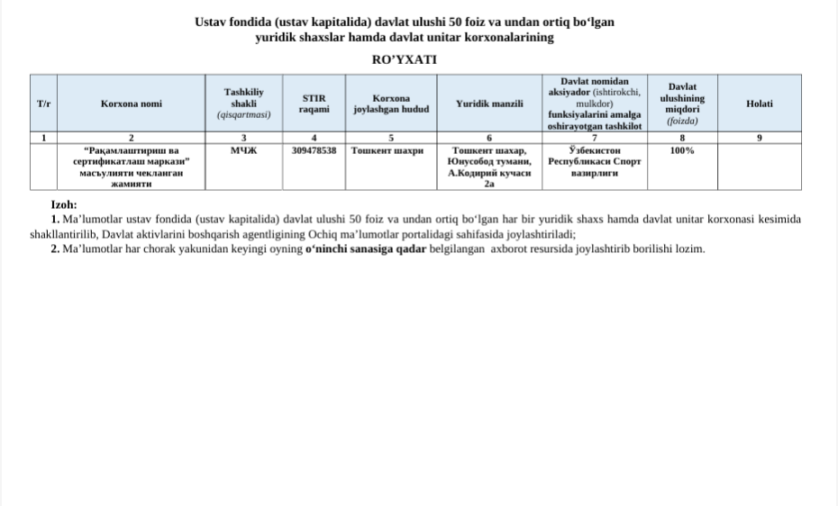 Ustav fondida (ustav kapitalida) davlat ulushi 50 foiz va undan ortiq bo‘lgan yuridik shaxslar hamda davlat unitar korxonalari ro‘yxati (davlat nomidan aksiyador (ishtirokchi, mulkdor) funksiyalarini amalga oshirayotgan tashkilot, korxona hududi, soliq to‘lovchining identifikatsiya raqami, davlat ulushi to‘g‘risidagi ma’lumotlarni ko‘rsatgan holda), shuningdek, ustav fondining (ustav kapitalining) 50 foizi va undan ortig‘i davlat ishtirokidagi korxonalarga tegishli bo‘lgan yuridik shaxslar ro‘yxati |
