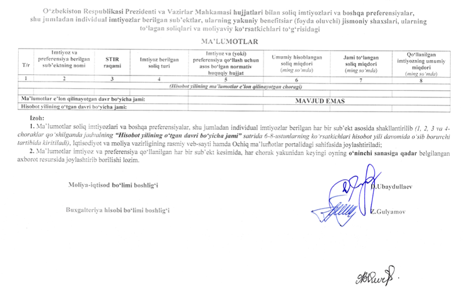 O‘zbekiston Respublikasi Prezidenti, Vazirlar Mahkamasi hujjatlari bilan soliq va bojxona imtiyozlari hamda preferensiyalar, shu jumladan individual imtiyozlar berilgan subyektlar, ularning yakuniy benefitsiar (foyda oluvchi) jismoniy shaxslari, ularning to‘lagan soliqlari va moliyaviy ko‘rsatkichlari to‘g‘risidagi axborotlar |