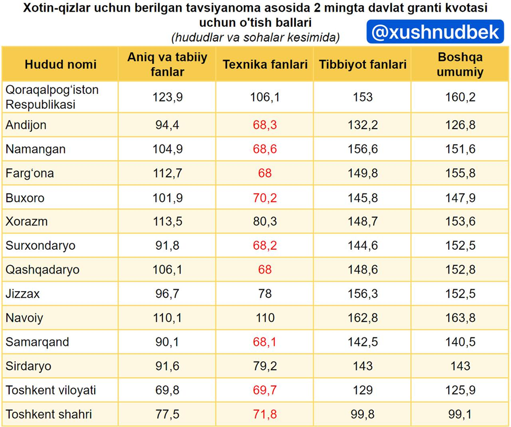 Xususan, amaldagi qonunchilikka ko‘ra tavsiyanomaga ega bo‘lgan xotin-qizlar uchun davlat granti asosida ajratiladigan 2000 ta kvotaning kamida 50 foizi (kamida 1000 ta joy) aniq va tabiiy fanlar, texnika va tibbiyot yo‘nalishlari uchun, qolgan kvotalar (kamida 1000 ta o‘rin) esa, umumiy boshqa barcha sohalar uchun ajratiladi.