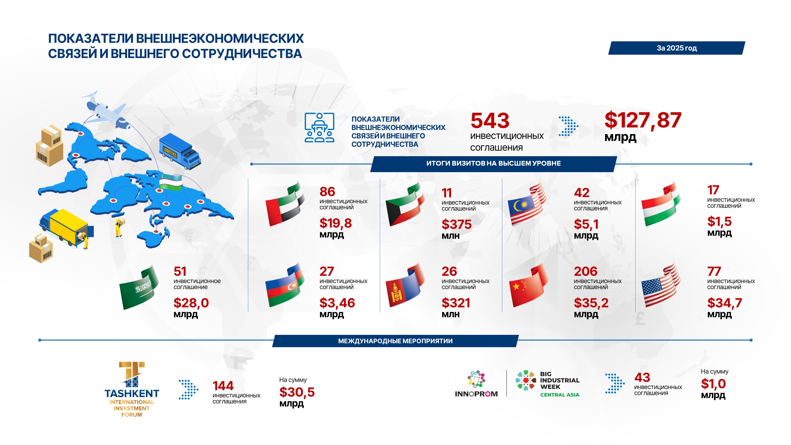 Министерство инвестиций, промышленности и торговли Республики Узбекистан (МИПТ) активно развивает международное сотрудничество как важное направление своей деятельности, направленное на углубление двусторонних и многосторонних отношений, реализацию совместных проектов, укрепление стратегического партнерства и продвижение экономических интересов страны за рубежом, включая переговоры и соглашения с зарубежными государствами и международными организациями по промышленности, торговле и инвестициям.