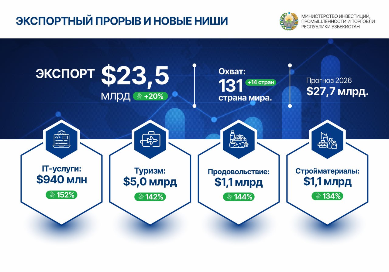 Данная деятельность осуществляется в рамках общей стратегии укрепления внешнеэкономических отношений и расширения участия Узбекистана в глобальной торговле. Подробные официальные данные, отражающие данные процессы, в том числе показатели внешней торговли и инвестиции, демонстрирующие динамику экономической активности, представлены на портале Комитета по статистике Республики Узбекистан: https://stat.uz/uz/rasmiy-statistika/merchandise-trade-2