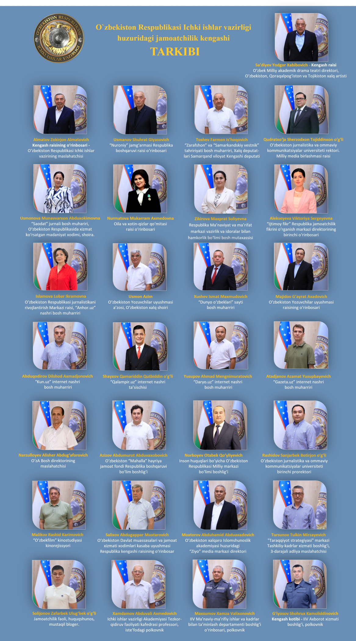 Жамоатчилик кенгаши таркиби Ўзбекистон нодавлат-нотижорат ташкилотлари миллий ассоциацияси билан келишилган.