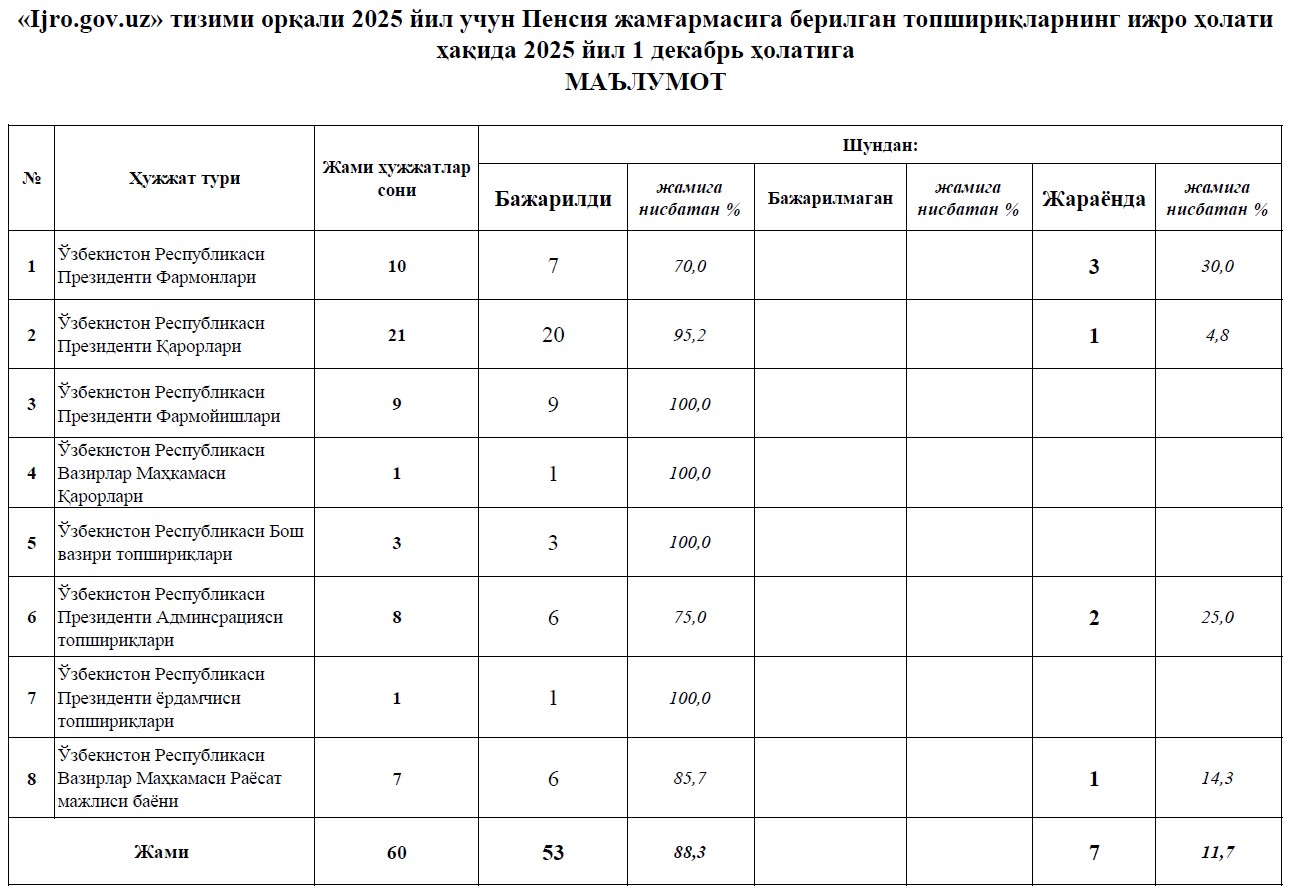 “Ijro.gov.uz” тизими орқали Пенсия жамғармасига берилган топшириқларнинг ижро ҳолати ҳақида маълумот